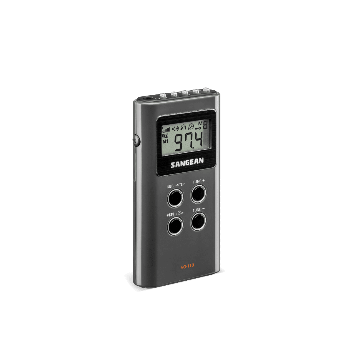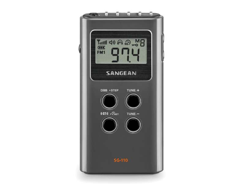 The SG-110 features 15 preset stations (5 AM / 10 FM), auto search, battery indicator, and turns off automatically after 90 minutes to conserve battery life.