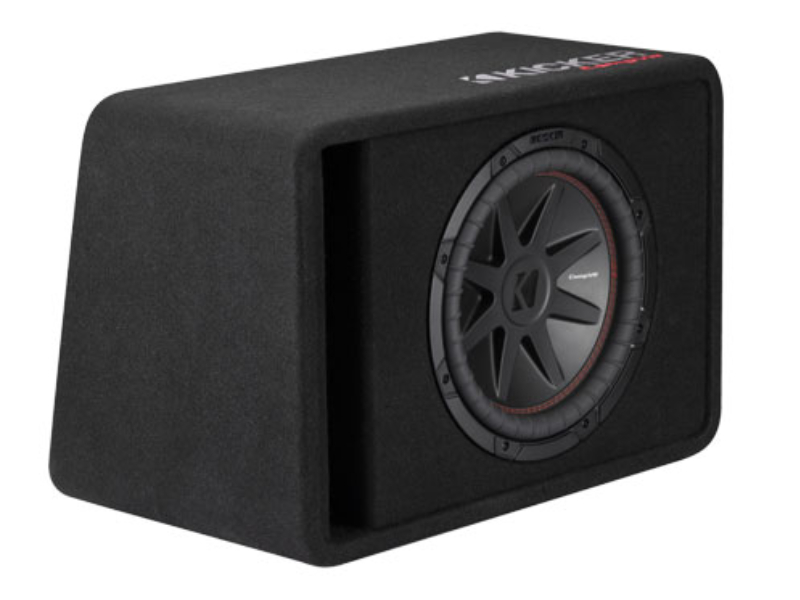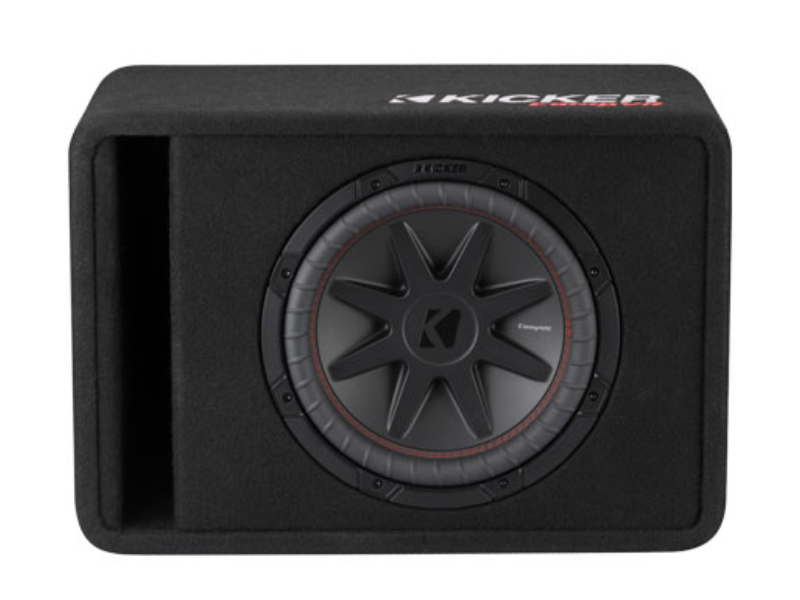 CompVR Subwoofers loaded in factory-tuned loaded enclosures have been reengineered for incredible KICKER bass with Forced-Air Cooling™. You get a cool, reliable speaker that lasts and lasts. Thick black carpeting gives the tough enclosure a sleek, refined look. The front-facing tuned port raises the bar for acoustic efficiency, creating incredible bass levels with minimal amplifier power.