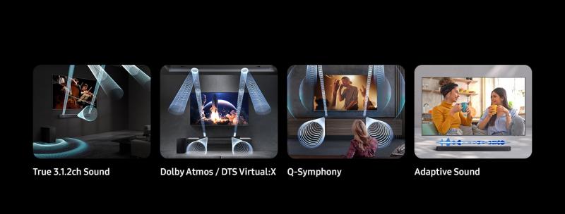 * Q-Symphony requires a compatible 2022-2025 Samsung TV (BU8000 and above for 2022 models, CU7000 and above for 2023 models, DU7000 and above for 2024 models, U8000F and above for 2025 models, and 2022-2025 models of The Frame).