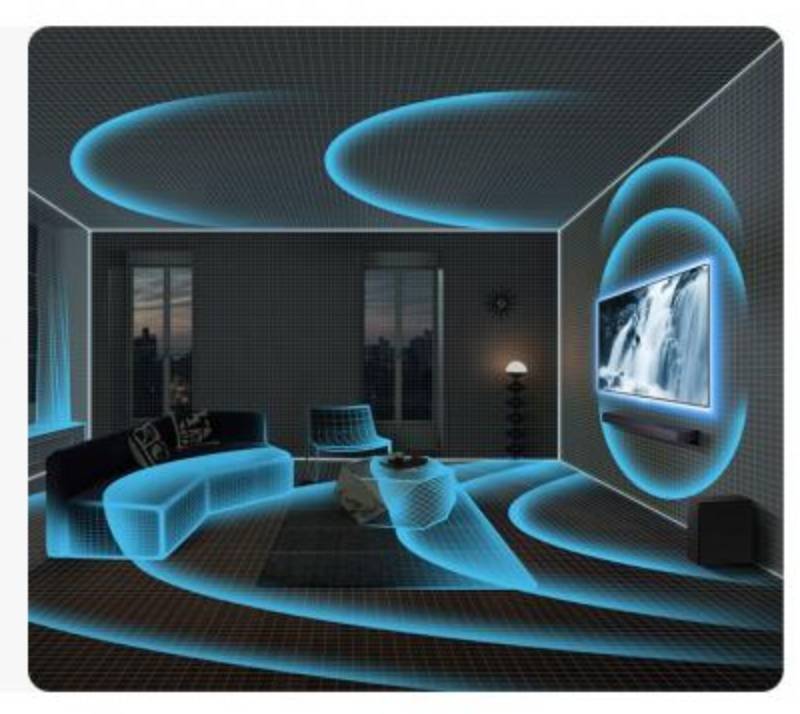 * 3.1.2ch (3 front and surround channels, 1 subwoofer channel, 2 up-firing channels). A wireless subwoofer included.