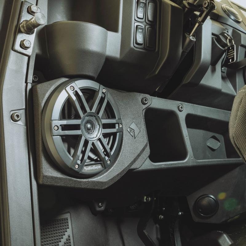 The Ranger Stage-2 is an aftermarket M0 Element Ready™ front and rear audio system. The kit features the PMX-1 multi-media source unit with 6.5” Element Ready™ speakers in front lower and rear upper speaker pods. A Polaris Ranger Poly Roof equipped with/without the Premium Roof Liner is required for installation of the rear speakers. This system is designed for select 2018 and newer XP 1000 FULL-SIZE (3-seat) and CREW (6-seat) models.