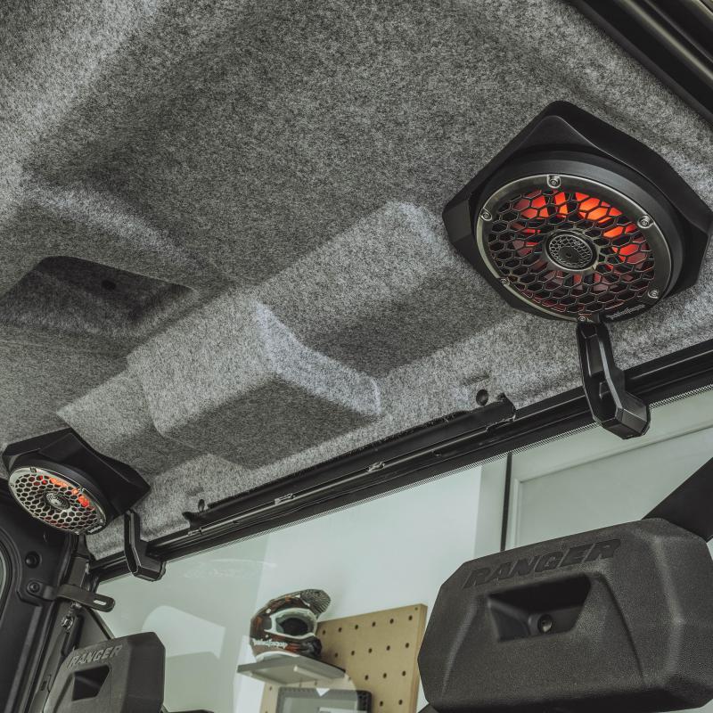 The Ranger Stage-6 is the ultimate aftermarket 1,500-watt M2 Color Optix™ front and rear audio system with subwoofer. The PMX-3 multimedia source unit features a SiriusXM® ready tuner and component video input for adding a backup camera in the future. All speakers are M2 Color Optix™ models for the highest sound quality. The 1,500-watt 5-channel amplifier gives you ultimate control of the 6.5” front speakers, 6.5” rear speakers, and 10” subwoofer make this the loudest audio system possible. Allows for future expansion for a secondary 10” subwoofer with rear-seats. A Polaris Ranger Poly Roof equipped with/without the Premium Roof Liner is required for installation of the rear speakers. The system is designed for select 2018 and newer XP 1000 FULL-SIZE (3-seat) and CREW (6-seat) models.