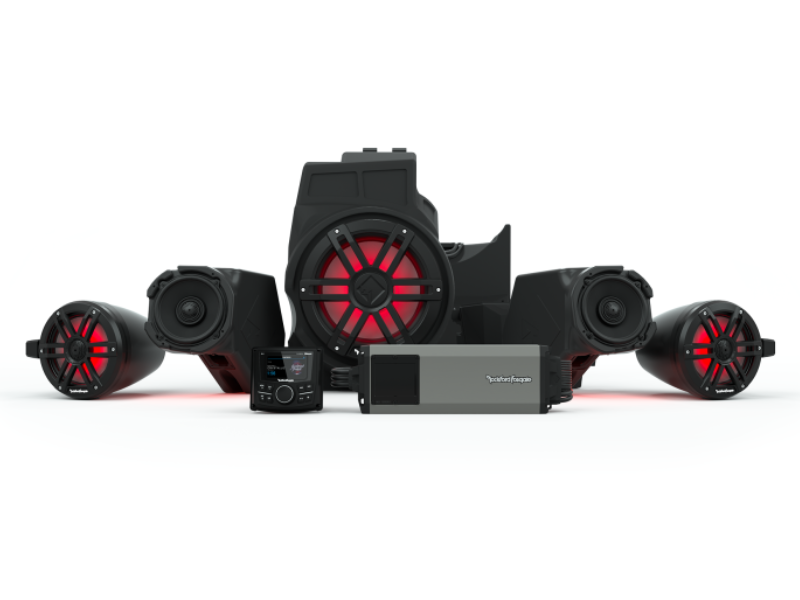 The Pro XP Stage 4 is a 1,500 watt audio system that takes entertainment to a new level with higher performance, louder output, and greater clarity. This complete waterproof solution provides the ability to take your UTV into any environment. The subwoofer enclosure – vented to provide maximum bass performance – offers the ability to seal the vent when submerging the vehicle. The plug-and-play design requires minimal cutting or drilling by using OEM mounting points and features an easy to set-up “Rockford Fosgate” preset to optimize performance. The Color Optix™ control allows RGB color adjustment of speakers and rear moto-cans in addition to a Rockford Fosgate illuminated logo for a finishing touch to the passenger dash.