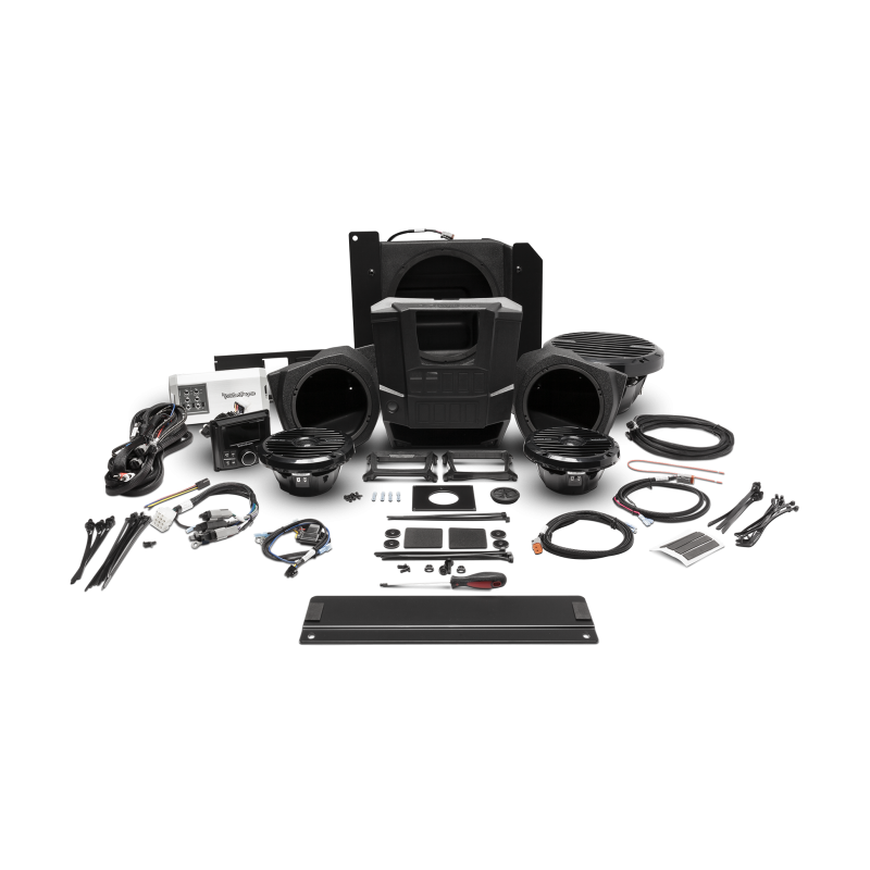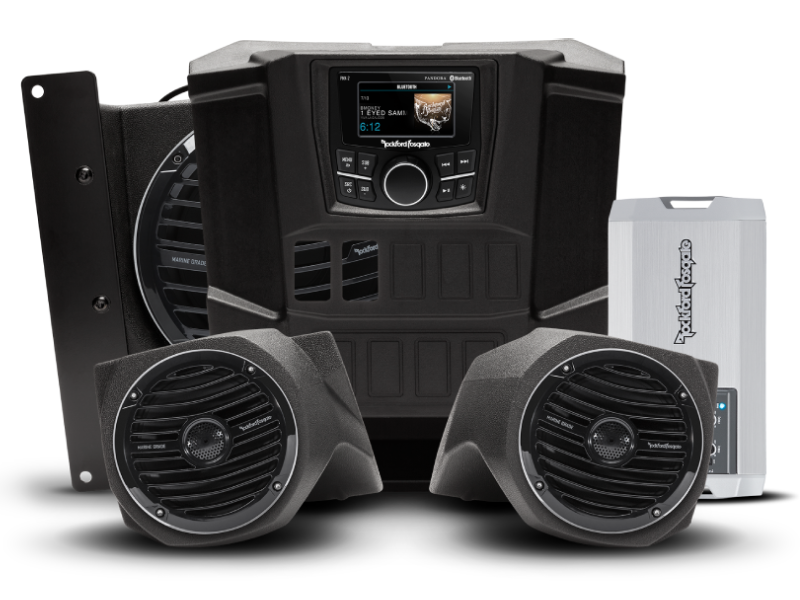 Building on the Stage 2 kit, we add our amplifier mounting and installation kit, a TM400X4ad 400-watt Element Ready amplifier and under seat subwoofer enclosure. This complete system gets you rocking out in no time whether you're working the fields or running the trails with your friends.