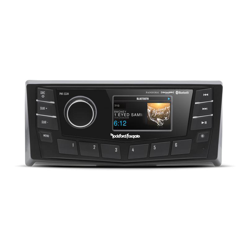 The PMX-5CAN digital media receiver is designed for marine and motorsports systems. The PMX-5CAN features a 2.7"full color TFT display for optimum viewing - even in full sun - that is optically wet bonded to prevent any dust or moisture penetration. It is IPX6 rated and uses a water resistant rotary encoder knob with white LED button illumination and front mounted sub level controls. Additionally, with features such as SiriusXM and Pandora capabilities, Bluetooth audio steaming with album art support for Apple and Android products and true 2 zone/2 source control, this unit becomes a true command center of any system. Output flexibility comes a 4x50W @ 2ohm internal amplifier or dual zone output RCA's allowing the addition of after-market amplifiers for more power and output. Add in the EEPROM memory system, custom GUI interface and wired remote expansion capabilities and you have the only media receiver you'll ever need. The PMX-5CAN also features CANbus functionality for connection to Raymarine MFD (Multi-Function Display) systems using the PMX-CAN adaptor (see Accessories tab.)