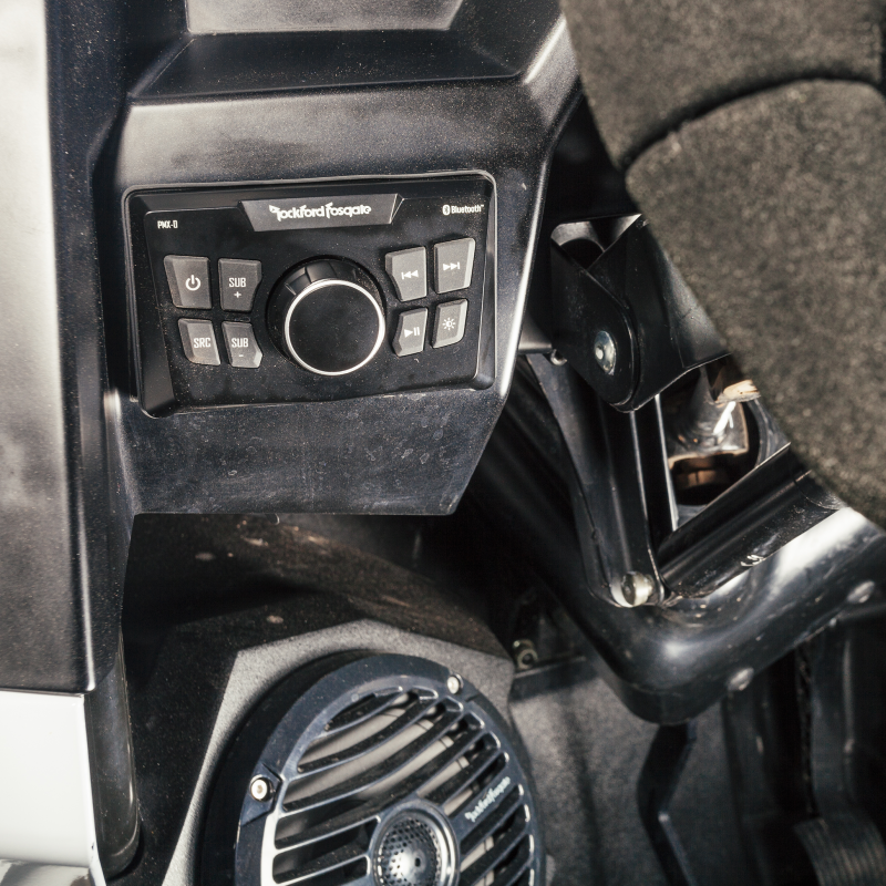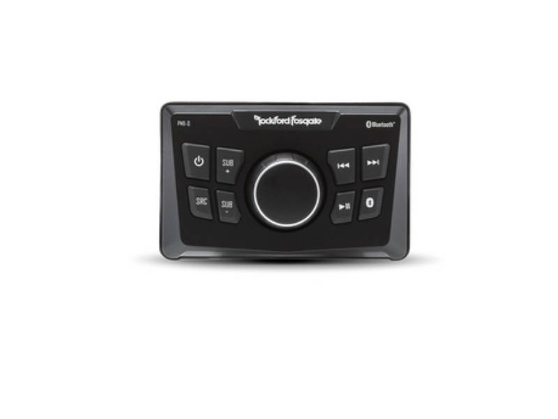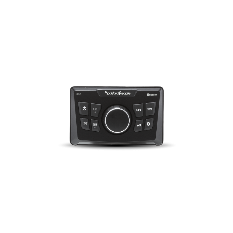 The PMX-0 is a ground up designed ultra compact digital media receiver ideal for small systems and vehicles. This unit Features Bluetooth streaming audio connectivity for both Apple and Android based devices, RCA Auxiliary inputs as well as Front, Rear and Sub RCA output connections. Control is provided through the water resistant rotary encoder knob and white LED backlit buttons and provide instant sub level control at your fingertips. The front panel is IPX6 rated for water spray intrusion and features a conformal coated PCB circuit board protecting the vital electronics. We further validate the unit with 500 hours of testing under both the ASTM B117 and D4329 testing standards to make sure it will hold up under years of daily use exposed to the elements.