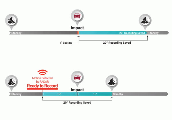 When in Energy Saving Mode 2.0, the Radar Module allows the U1000 dash cam to extend its Parking Surveillance mode duration by reducing the power consumption. When a motion is detected by the Radar Module, the U1000 wakes up and gets ready to record. If an impact is detected, a 20 second video (10 seconds before and 10 seconds after the impact) is saved in a dedicated folder on the MicroSD card. When no impacts are detected, the U1000 does not save the footage and resumes Energy Saving Mode 2.0.