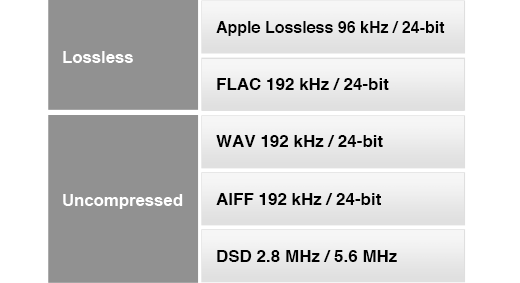 | File Format | MP3, WMA, MPEG4 AAC, WAV, FLAC, AIFF, ALAC, DSD |