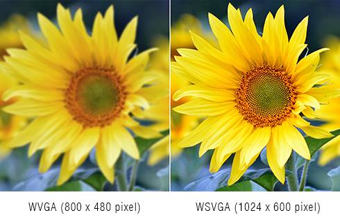 The WSVGA display reproduces approximately 1.6 times higher resolution than the conventional WVGA display.
