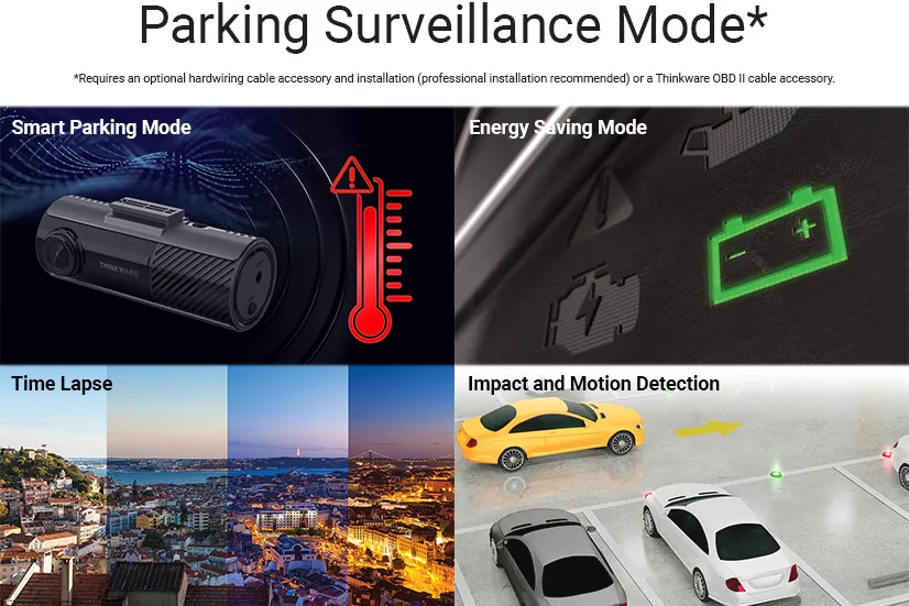 *Requires an optional hardwiring cable accessory and installation (professional installation recommended) or a Thinkware OBD II cable accessory.