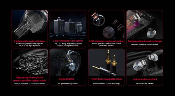 6 Balanced Armature Drivers | 3-way crossover system 316L stainless steel construction | 3rd-gen industrial design High-purity silver-plated | monocrystalline copper cable Angled MMCX connectors | Twist-lock swappable plugs Hi-Res Audio certified