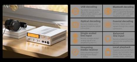 | Working mode | USB DAC mode/Coaxial decoding mode/Optical decoding mode/Line in mode/Balanced in mode/Bluetooth receiving mode/Streaming media receiving mode/Local playback mode |