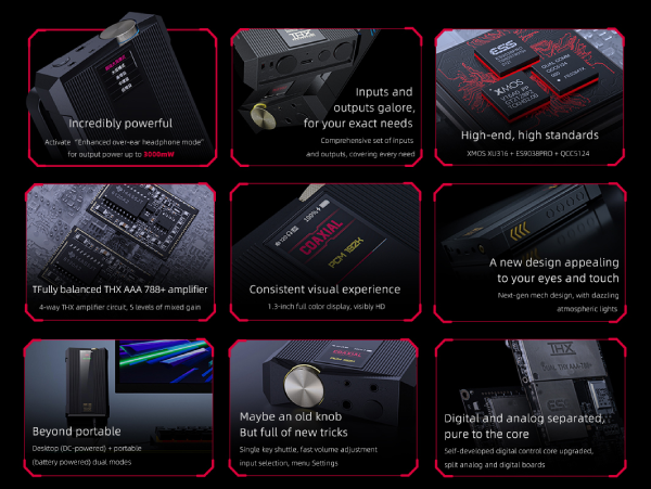 3000mW output power | Fully balanced THX AAA 788+ amplifier Dual portable/desktop power supply modes | Numerous inputs and outputs High-end XMOS XU316 + ES9038PRO + QCC5124 configuration Self-developed digital control core | Next-gen mech design Color IPS display | Multiple intelligent protection systems