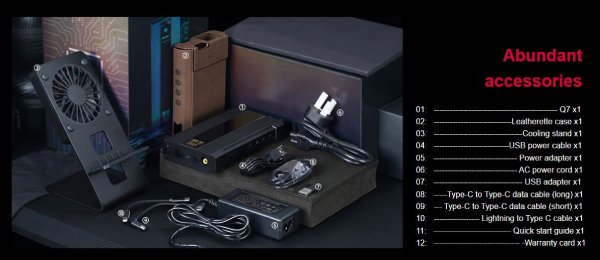 True to FiiO’s heritage, the Q7 comes with many accessories including: low-noise power adapter, cooling stand, pre-applied tempered film, leatherette case, dust plugs, and 4 different cables*. You’ll be set up in no time with the Q7.