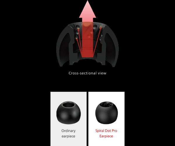 The earpiece, which affects the sound quality, has been newly developed for the HA-FW1000T. The Spiral Dot Earpiece is a unique earpiece designed for high sound quality. Dimples on the inner wall diffuse the reflected sound inside the earpiece, which is the cause of sound deterioration, and suppresses the muddiness of the sound.