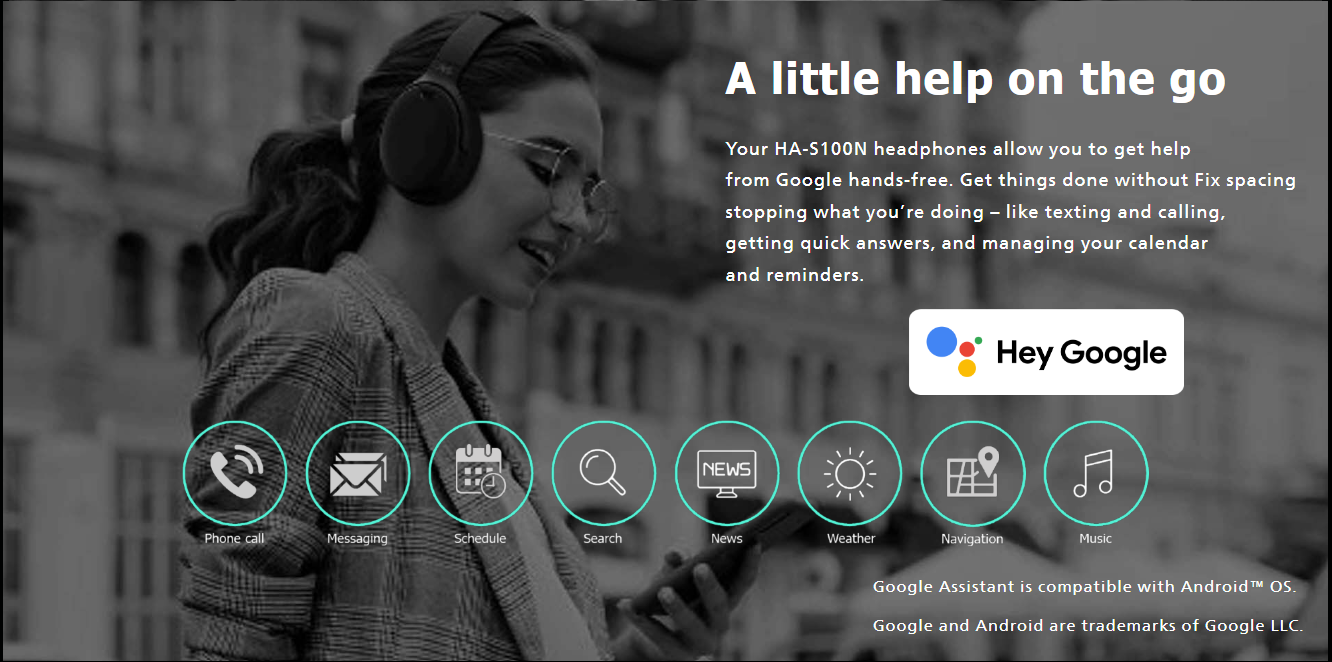 Our top headphone offers Hybrid Noise Cancelling for immersive sound, free of noise distraction.Full touch control allows for simple operation of all functions with just the touch of a finger, and Automatic ON/OFF feature for quick pairing and easy operation. The HA-S100N has high-quality protein leather in the headband and ear pads for a perfect fit and comfort during long listening. Includes swivel earcups and two-way foldable design for easy carrying.Convenient Google Assistant and Google Fast Pair Compatible.