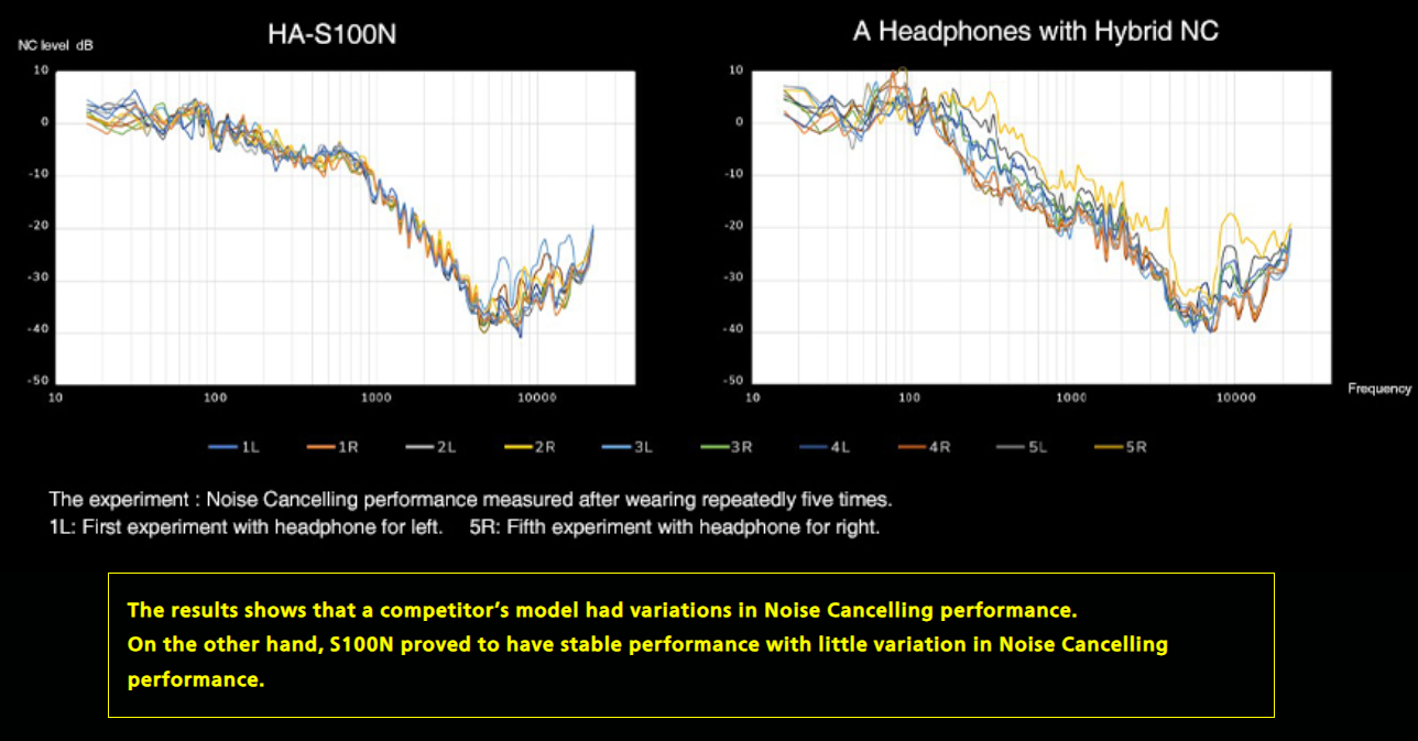 The S100N provides stable Noise Cancelling performance even after repeated frequent use, such as teleworking or outdoors. The thickness of earpads and ultimate fit contribute stable passive Noise Cancelling performance by their absorbing variations in wearing position.