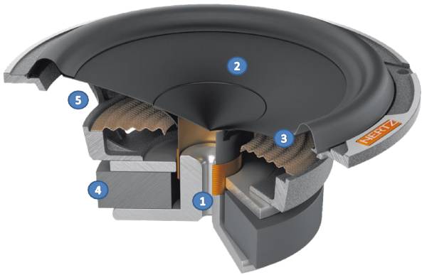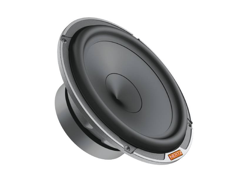 The MP 165P.3 car audio woofers electro-acoustic parameters have been forged to give it the pure and solid sound of an authentic mid-bass, designed for high dynamic systems. The voice coil with a generous 14 mm height, has a nominal 3 Ω impedance in addition to an increased power handling. These features provide the ability to maximally exploit the power of the Hertz HCP and HDP amplifiers as well as all the 2 Ω stable electronics. The ferrite 95 mm diameter magnet enables a +/-4.5 mm voice coil linear excursion, ensuring utmost control at all times. The Boundary Free Surround moves a bigger amount of air, and the V-cone® profile improves the offaxis dispersion, the real in-car listening condition. The sophisticated aluminium alloy basket neutralizes the undesired vibrations.