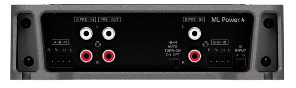 The ML Power IN module features a Speaker In input (with balanced circuitry minimizing noise) for OEM head units and an RCA IN input for aftermarket sources. When the Speaker In is used, the ART™ function (Automatic Remote Turn On-Off) is enabled, managing the amplifier remote turn on to avoid unpleasant “bumps”.
