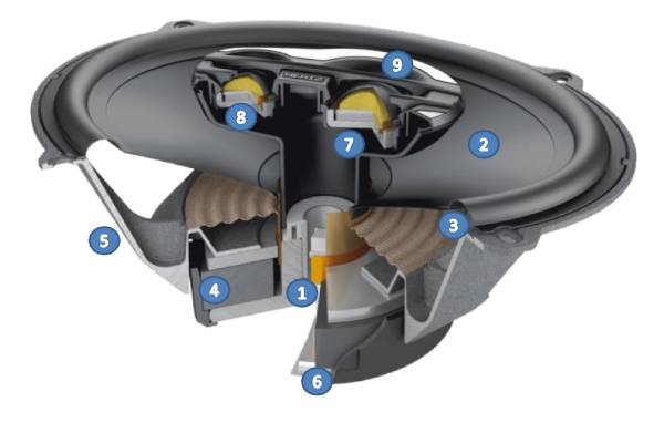 The three-way MPX 690.3 car audio coaxial, optimized for rear deck mount, features a 28 mm Tetolon tweeter with Neodymium magnet and faceplate profile maximizing the off-axis dispersion. A supertweeter strengthens the emission of very high frequencies and the basket radial venting system ensures low operating temperatures. The sound has an impressive impact and ensures perfect control, also with extensive high dynamic listening.
