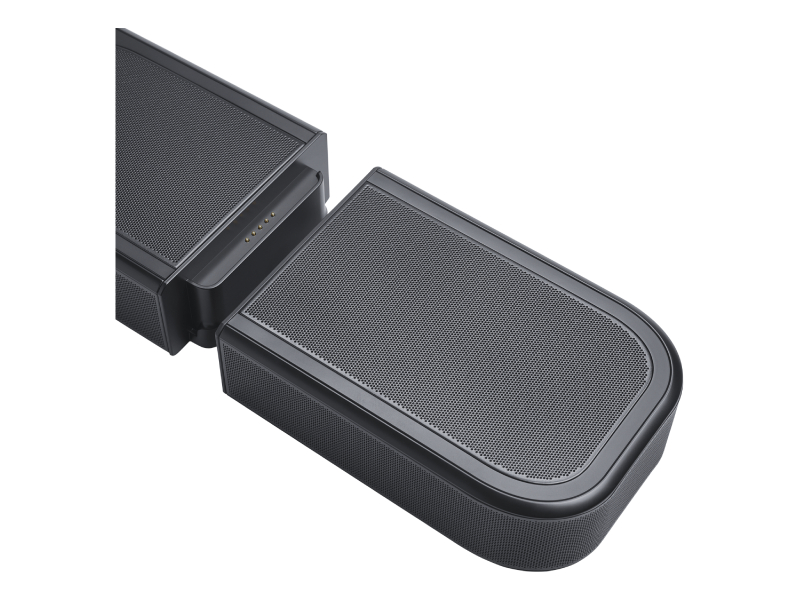 Elevate your 3D surround sound experience with dynamic, immersive height. Four up-firing speakers in the soundbar and wireless rear speakers deliver true Dolby Atmos® sound. No extra wires. No power connections. Just lift the detachable surround speakers off the soundbar—you can do it with just one hand—and place them behind where you want to sit, instantly transforming them into a true surround sound setup. It's that simple. Whether you're binge-watching your new favorite show or hosting a movie night, the speakers' rechargeable long-lasting batteries mean you'll enjoy immersive, cinematic surround sound for hours. When you’re done, simply place them back on the soundbar to charge overnight.