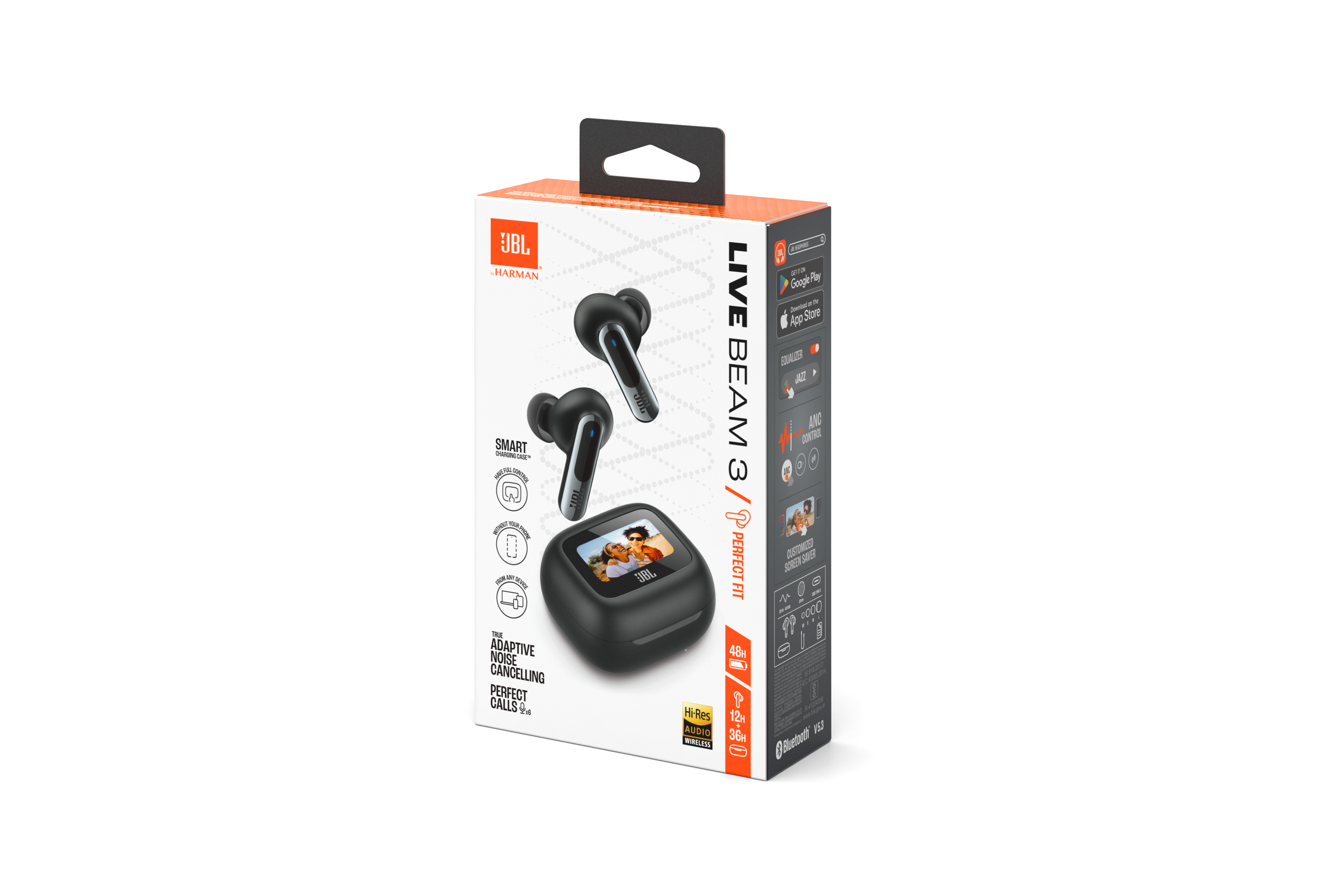 Get customized sound without ever looking at your phone. Use the controls on the Smart Charging Case™ of the JBL Live Beam 3 true wireless noise-cancelling earbuds with Hi-Res Audio to customize all their features without opening the JBL app on your device. Adjust volume and EQ, control your music, take phone calls, see messages—you can even customize the screensaver with your favorite photos. And that’s before you even get to enjoy the monumental JBL Signature Sound of the Live Beam 3 earbuds themselves. Best-in-class True Adaptive Noise Cancelling tunes out distractions. JBL Spatial Sound makes movies and music truly immersive. And if you have to take a call, 6 mics ensure perfect sound quality even in the noisiest surroundings. All this plus a 48-hour charge: 12 hours in the buds* and another 36 in the case—and they can charge wirelessly. The charging case features a loop to attach a lanyard for even more convenience. Great sound has never been simpler. (*with ANC off)