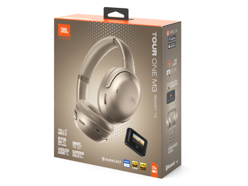Get ready for the JBL Tour One M3 Smart Tx, our best-sounding and most feature-rich over-ear headphones ever. Lose yourself in lossless audio from the built-in DAC. Or go wireless with stunning Hi-Res Audio via Bluetooth®. JBL Spatial 360 sound with integrated head tracking makes movies and mobile games even more immersive. True Adaptive Noise Cancelling 2.0 tunes out distracting ambient noise in real-time, so you can concentrate on your work—or your favorite playlist. Use the JBL Smart Tx universal Bluetooth® Audio Transmitter to elevate your wireless sound experience and connect to in-flight and other public spaces entertainment systems and seamlessly stream from Bluetooth® devices. Customize and control your sound through the JBL Headphones app, accessible from the JBL Smart Tx display and share audio via the advanced Auracast™ connection with other Auracast™-enabled devices.
