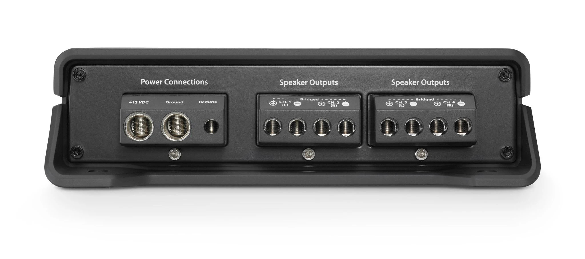 Utilizing our exclusive NexD™ high-speed switching technologies, the JD400/4 amplifier is engineered to deliver loads of clean power, with excellent efficiency and low distortion. This little guy churns out 100 watts of audio from each of its four channels into 2 ohms (14.4V, 1% THD) and is fully bridgeable, so it can be used as a 3-channel amplifier, or as a 2-channel amplifier producing a whopping 200W x 2 into 4 ohms.