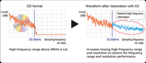 K2 is a JVC original technology that reproduces the original master sound by expanding the frequency range. For example, K2 will expand the digital data of the audio CD recorded at 44.1kHz to 192kHz. It is also possible to recreate the high-frequency range above 20kHz that is cut during the CD formatting.