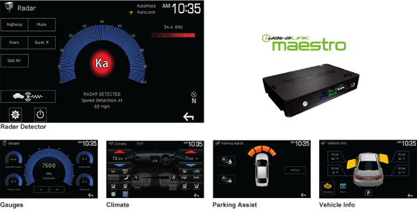 iDatalink Maestro RR/RR2 (sold separately) enables the retention of the factory steering wheel audio controls, factory amplifier, secondary displays, and can even display vehicle information (performance data, climate controls, battery voltage, etc.) when connected to compatible vehicles. Radar detector information can also be displayed on the screen when used with a compatible K40 radar detector system (sold separately).