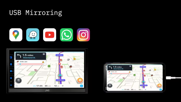 By installing the “Mirroring OA for JVC” app, your Android phone is seamlessly displayed on the receiver's screen via USB. You can enjoy a variety of apps such as Waze, YouTube, and Instagram. Touch control is possible from both screen and smartphone.