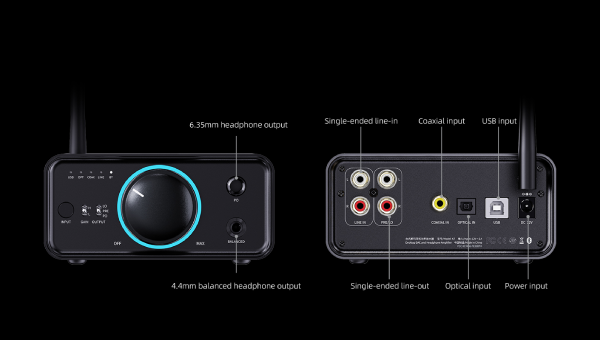 The K7 contains USB, optical, coaxial, and RCA inputs. Outputs are 6.35mm single-ended and 4.4mm balanced for pleasant listening no matter the headphones.