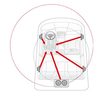Sound coming from a variety of speakers located within your car are time aligned to arrive at your ear at exactly the same time.