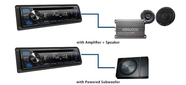 The KENWOOD receiver has RCA outputs to expand the system to connect to an additional amplifier or powered subwoofer.