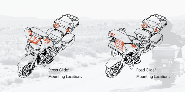 TWO 2-CHANNEL POWER AMPLIFIERS, 6.5” FRONT SPEAKERS, & 6.5” REAR SPEAKERS PACKAGE DESIGNED AND ENGINEERED FOR 2014-UP HARLEY-DAVIDSON® ULTRA MOTORCYCLES WITH REAR SEAT/TOUR PAK. INCLUDES WIRING AND MOUNTING PLATES FOR PLUG AND PLAY INSTALLATION