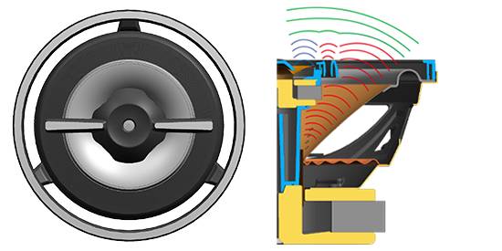 This unique shape of the tweeter creates strong frontward sound as well as a wider sound field in 5kHz and higher frequencies.