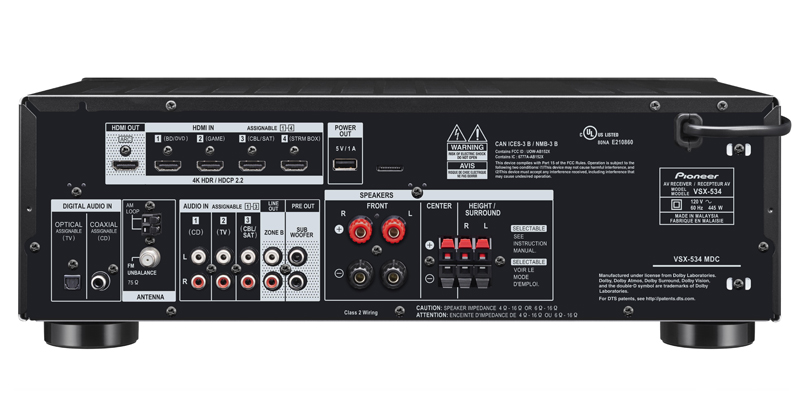 The VSX-534 comes in a user-friendly new design, with 12 % slimmer size than the previous model for easy installation, 4K indicator, and Personal Preset and Bluetooth Input buttons on the front panel. Immerse in enveloping sound with Dolby Atmos and DTS:X audio formats. Or even without height or surround speakers, you can still enjoy virtual 3D surround effect with Dolby Atmos Height Virtualizer and DTS Virtual:X. The AV receiver is compatible with Ultra HD, HDR10, HLG, and Dolby Vision with support for HDCP 2.2, so you can fully appreciate premium content such as 4K videos.