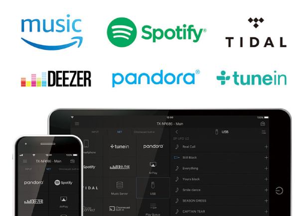 Use Works with Sonos, Chromecast built-in™, AirPlay 2, and DTS Play-Fi®; includes Spotify®, Amazon Music, Pandora®, TIDAL, Deezer, or TuneIn streaming services