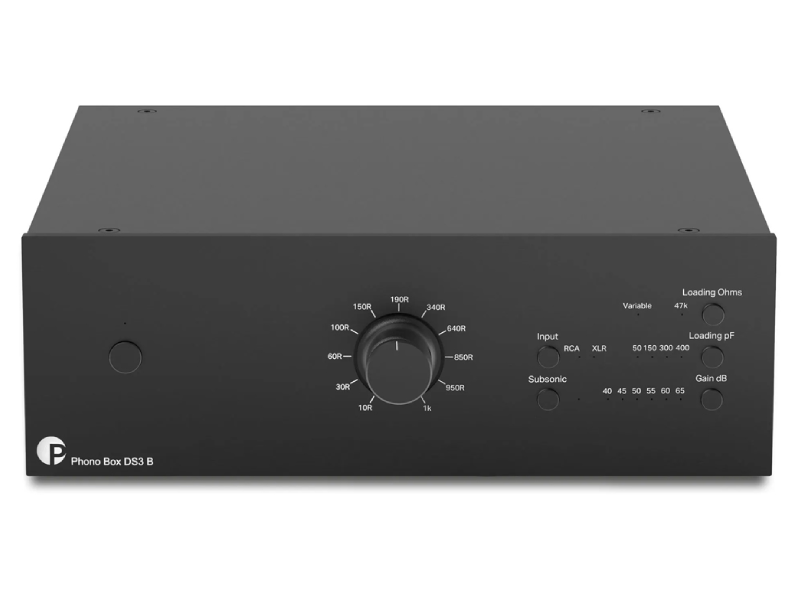 The Phono Box DS3 B employs a steel chassis enveloped by aluminium panels. This construction offers very high rigidity and isolation against interferences, which is essential for the new technology inside. Magnetic wooden side panels are available separately as add-ons. You can connect up to two turntables simultaneously – all parameters for each input get stored in the memory. Perfectly match the Phono Box DS3 B to a wide variety of cartridges. Load impedance can be set continuously via a potentiometer, a system invented by Pro-Ject Audio Systems, to adjust the impedance during playback and assess the impact of different loading options in real-time. No other manufacturer implements this feature as elegantly!