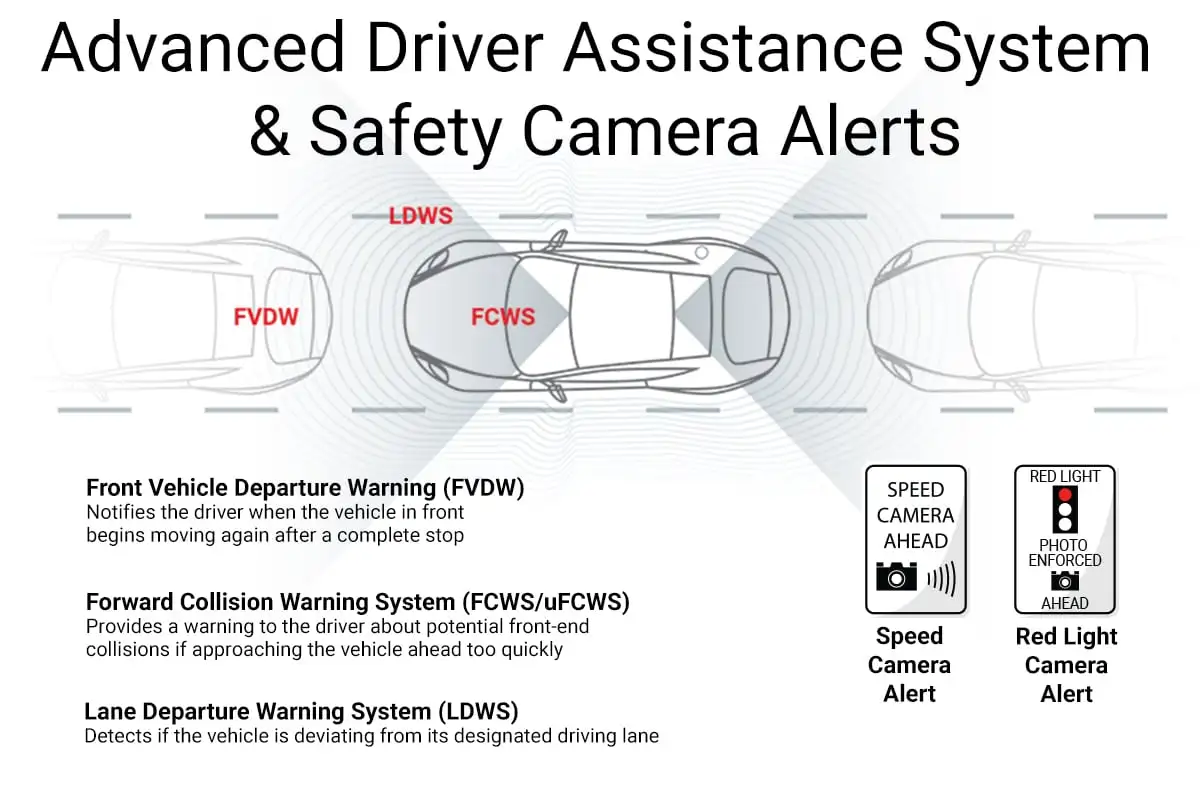 Pair the Q200 with the included GPS Antenna accessory to enable speed and red-light camera alerts and embed GPS data (speed, time, and location) into video footage.