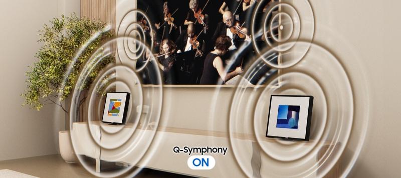 * Q Symphony is compatible with select Samsung TVs and Soundbar newly launched from 2024 and Music Frame via Wi-Fi. ** For a complete list of compatible models, please refer to samsung.com for more information.