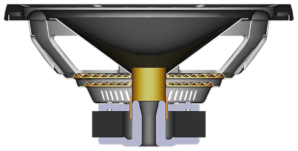The acoustically optimized spider allows for higher power handling and airflow, with a profile designed for more rapid and precise cushioning of the speaker cone. To increase signal integrity and prevent sound interference, the lead wire from the voice coil is also sewn to the spider, reducing wire movement.
