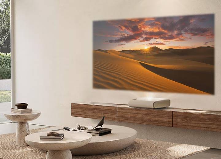 Now you can set up your projector close to the wall. With our ultra-short throw technology, The Premiere 7 needs only a short distance to project cinematic 4K images up to 120 inches in size.