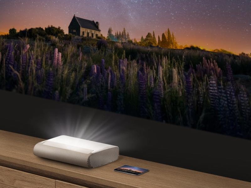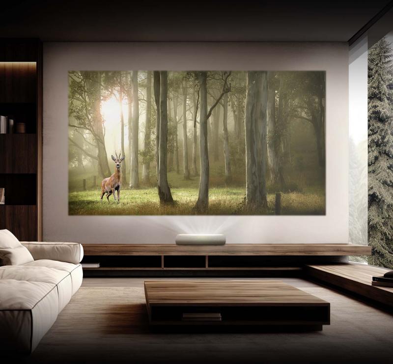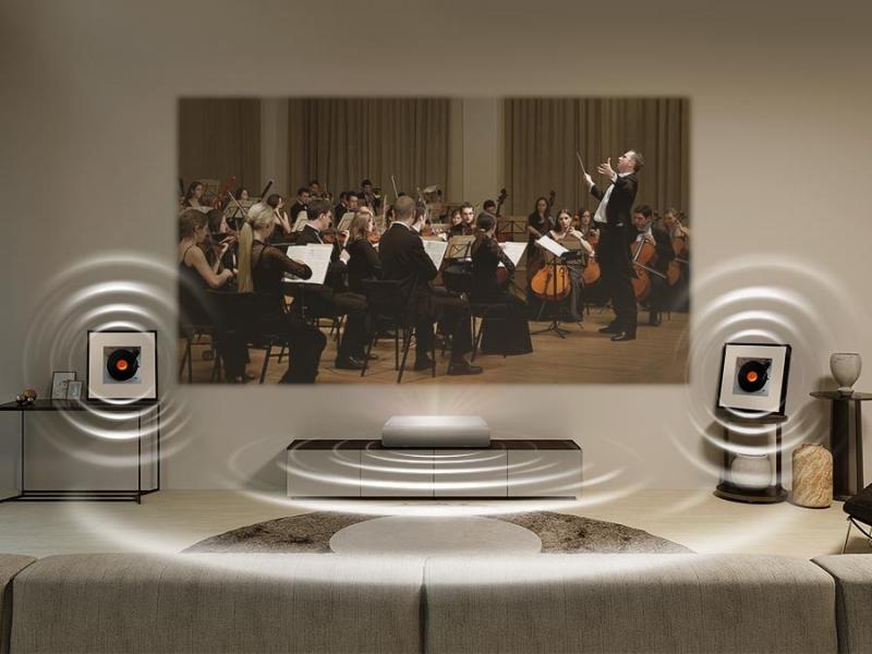 Now you can set up your projector right by the wall. With our ultra-short throw technology, The Premiere needs only a very short distance to project cinematic 4K images in super large sizes up to 130 inches.