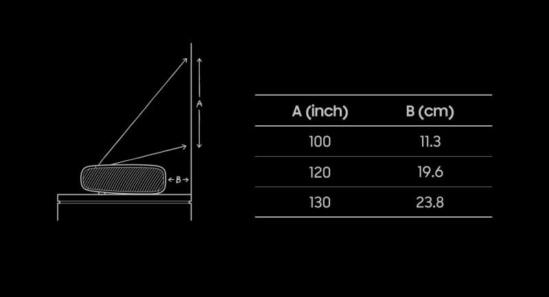 * Images are simulated and for illustration purposes only. The Graphic User Interface (GUI) specifications, which do not affect product performance, are subject to change without notice. ** Actual product may differ from image shown. Please see our product gallery. *** The laser projector can be projected on a flat white or bright monotone wall without setting up an additional screen. For a more optimized experience, using a screen dedicated to ultra short throw projector is recommended. **** The screen sizes for each projection distance may differ depending on the installation environment.