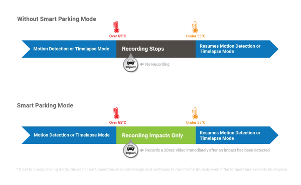 Energy Saving Parking mode saves a 20-sec video clip only after an impact has been detected (20s immediately after the event), allowing the U3000 to reduce its power consumption and remain in Parking mode for a longer duration