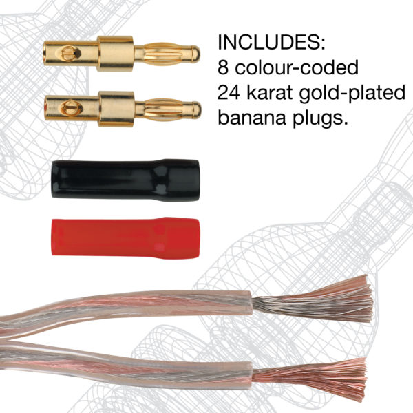 - Includes 8 colour-coded 24 karat gold-plated banana plugs.