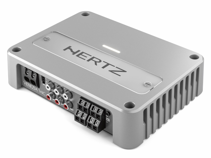 Venezia V4C compact marine amplifier features an optimized power/size ratio boosting 110 W x 4 (4Ω) and 380 W x 2 (4Ω)! Hertz Advanced Class D technology maximizes efficiency and power while minimizing heat and electromagnetic radiation - enhancing sound quality that reaches new highs with Hi-Res certification! High-powered channels with bridging capability deliver the output levels needed in the marine environment. Venezia V4C is engineered and tested for marine applications (UV, salt-fog, vibrations, high/low temperature, thermal shock) and has obtained the IPX2 certification. The Safe-Lock Input, Output, and Power connections streamline installation and enhance durability in the field. The fanless convection cooling system is integrated into the cast heat-sink chassis. The balanced fully-differential input circuitry rejects electromagnetic noise and interference. The powerful and flexible preamp filter options are far beyond most mobile amplifier capabilities. Last but not least, Venezia V4C is fully protected by short-circuit, overload, and thermal protections - with auto-resetting.