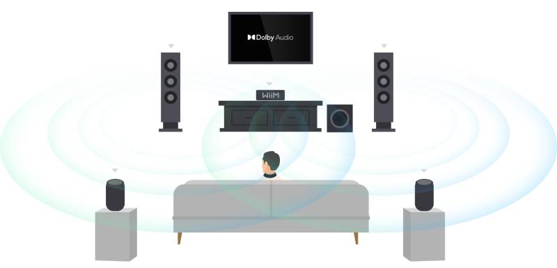 Home Theater Mode: Functions as front, center, or surround channel in a Dolby 5.1 setup via HDMI ARC