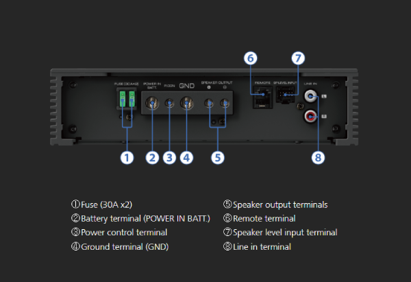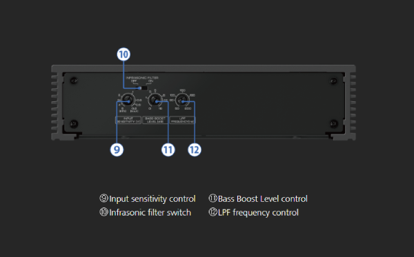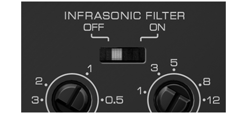 When the Infrasonic Filter Switch is turned on, the amplifier cuts off the low frequencies below 25Hz, which makes the amplifier’s power supply and output devices more efficient, providing clear bass output.